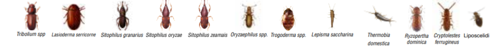 | Cryptolestes ferrugineus | Lesák moučný | Poškozuje céréálie i obiloviny, přežívá i při nízkých teplotách, zvyšuje riziko rozvoje plísní. |